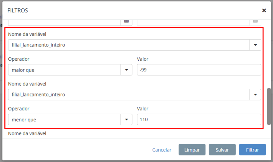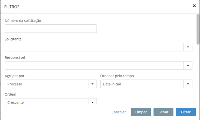 Abaixo dos campos de filtro, estão disponíveis as seguintes opções: Cancelar, Limpar, Salvar e Filtrar.