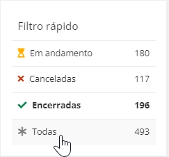 Acessando essa tela, os processos com pelo menos uma etapa em andamento são automaticamente exibidos. Um filtro rápido está disponível ao lado, permitindo navegar entre as solicitações Em andamento, Canceladas, Encerradas ou Todas. Além disso, o número de solicitações em cada status é exibido.