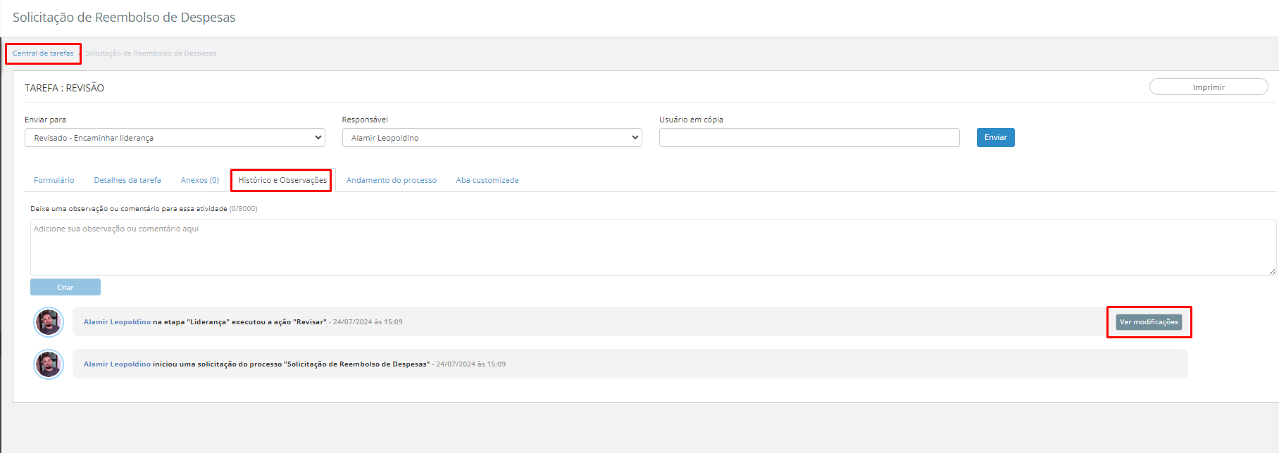 Na central de tarefas, acesse a aba Histórico e Observações e, ao lado da ação desejada, clique em Ver modificações.