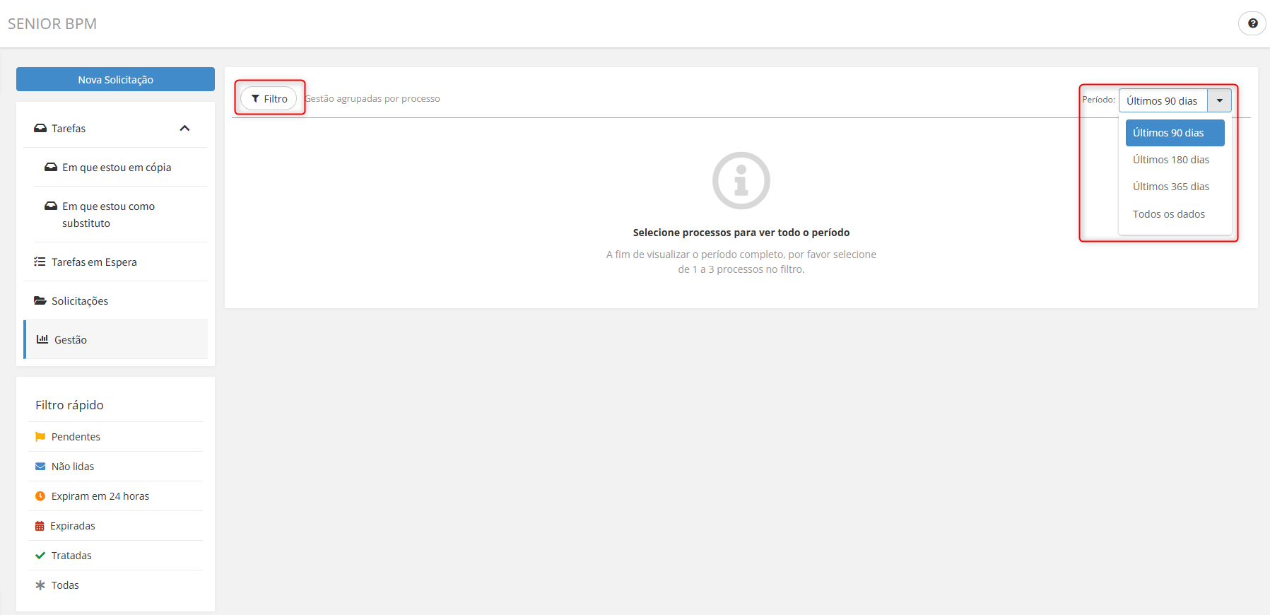 Na central de tarefas, na área de solicitações e gestão, estará disponível o botão período. Você poderá selecionar o intervalo de tempo entre 90, 180 e 365 dias. Além destas opções, você poderá selecionar também a opção todos os dados que irá exibir todas as tarefas.