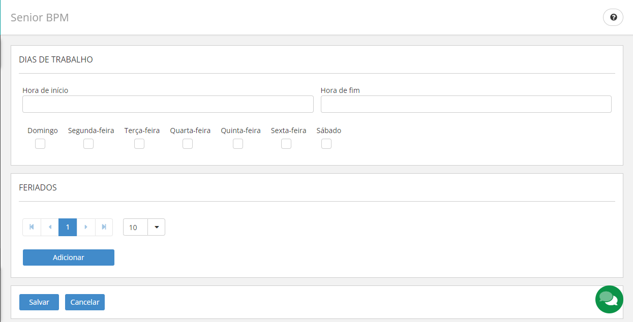 Para parametrizar em um calendário quais dias da semana são dias úteis, acesse Senior X > BPM > Configurações > Calendário. Defina o horário útil do dia, ou deixe zero se desejar considerar o dia inteiro na contagem do SLA. Também pode-se definir quais dias da semana são úteis, bem como informar feriados para serem desconsiderados na contagem do SLA.