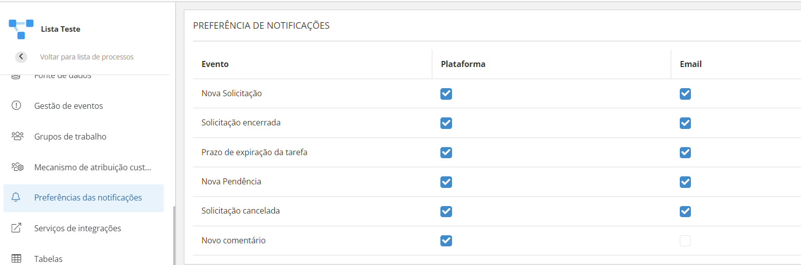 Antes de prosseguir com a configuração, verifique o nome do processo para o qual deseja realizar as alterações. Certifique-se de que as opções para o envio de e-mails estão marcadas para os eventos desejados. Se uma dessas opções estiver desmarcada, o e-mail não será encaminhado para o evento correspondente.