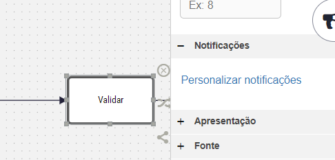 2. Dentro do Fluxo do processo, selecione a etapa que deseja que a notificação seja enviada, e clique na opção Notificações > Personalizar notificações no menu lateral direto do editor de fluxos;