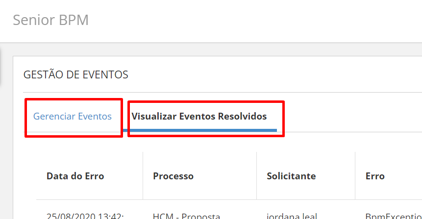 Selecione um processo existente e, em seguida, vá para a aba Gestão de Eventos.