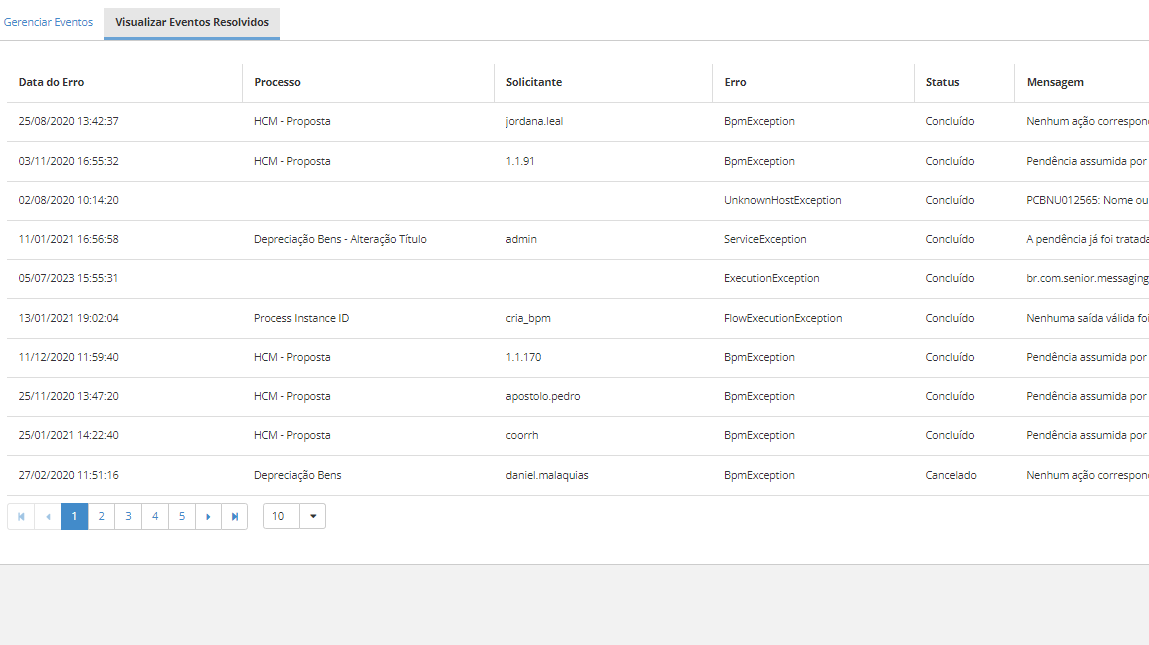 Na aba Visualizar Eventos Resolvidos, os usuários podem visualizar os eventos que já foram resolvidos. A visualização é organizada nas seguintes colunas: