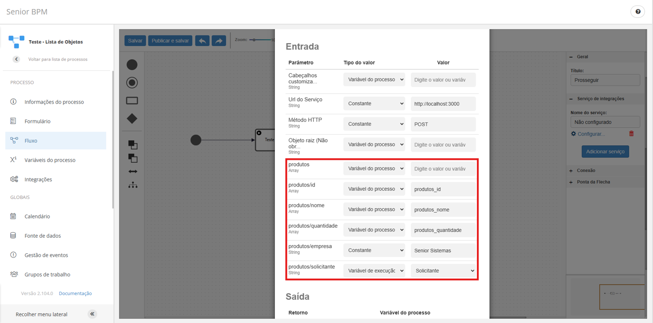 2.3.2 Configuração do Serviço de Integração no Fluxo do Processo BPM - Execução do Processo e Análise dos Dados Enviados