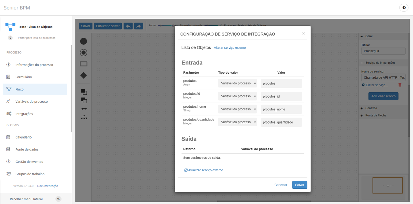 Após configurar o Serviço de Integração, é possível salvar e publicar o processo.