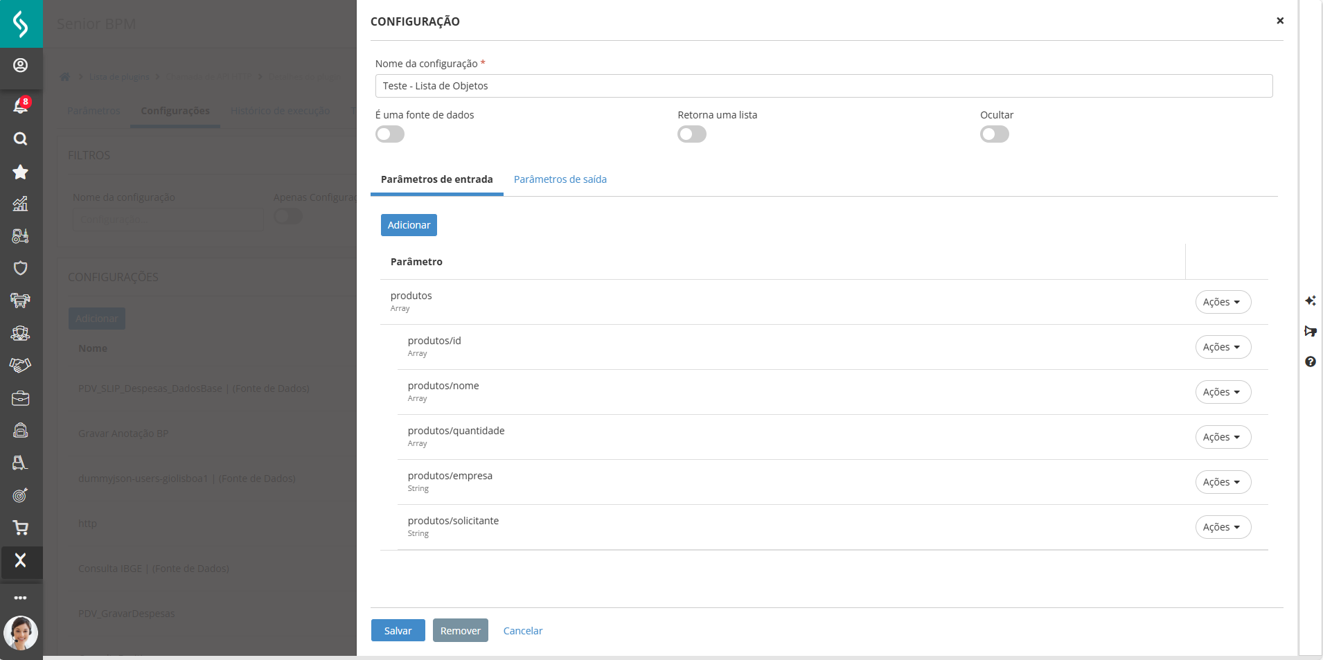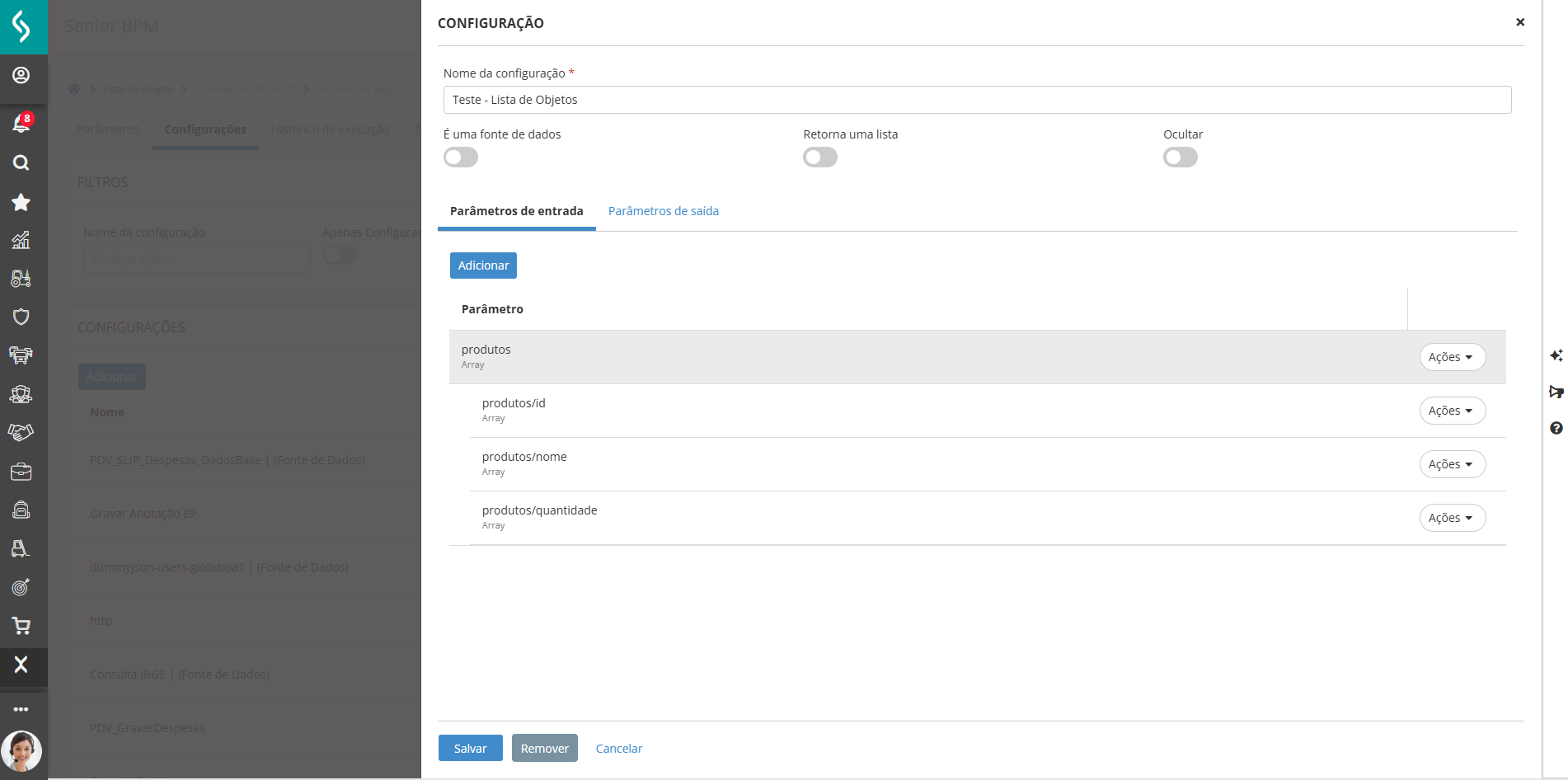 A referência dos campos das Listas de Objetos enviadas pelos Plugins é baseada na configuração do próprio Plugin, diferentemente do uso de um Serviço Externo. Nesse caso, os campos definidos no Plugin determinam quais serão enviados, enquanto os nomes dos campos no formulário do fluxo do processo servem apenas para identificar a origem dos valores.