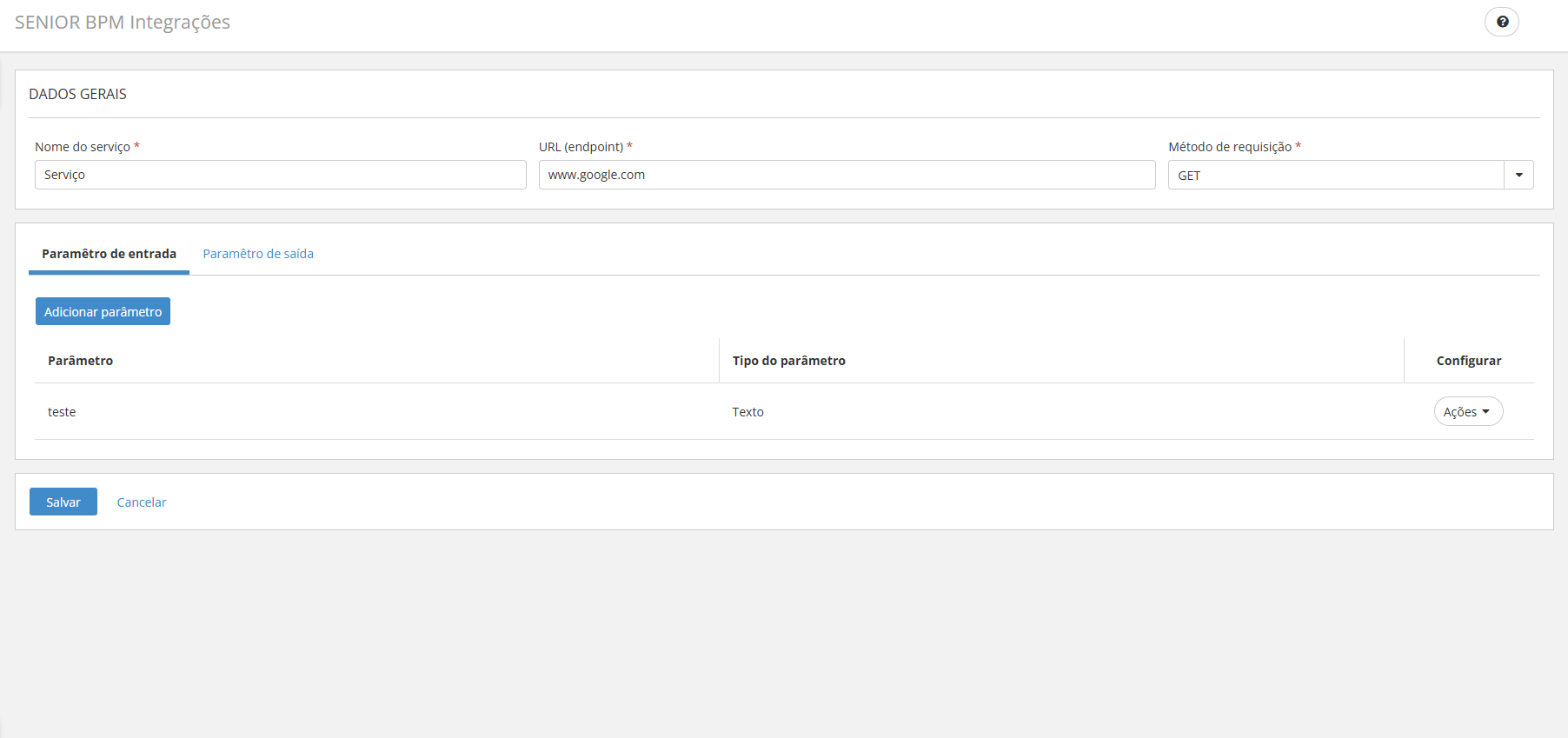 Em seguida, ao selecionar um serviço e acessar a opção de configuração, uma tela será exibida com os campos para preenchimento e as ações disponíveis.