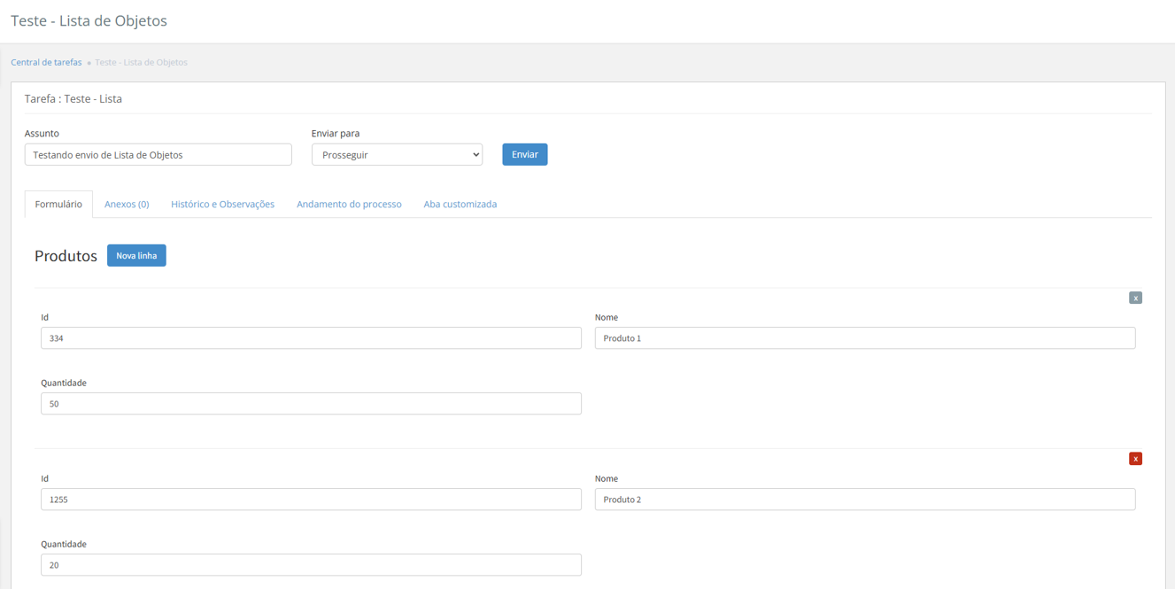 Para enviar a Lista de Objetos, primeiro é necessário criá-la em um formulário ECM, considerando os seguintes campos de exemplo: