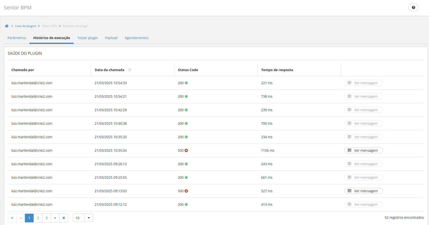 Para verificar o funcionamento do plugin, acesse a sua tela e vá até a aba Histórico de Execução. Nessa seção, é possível consultar os retornos específicos do plugin.