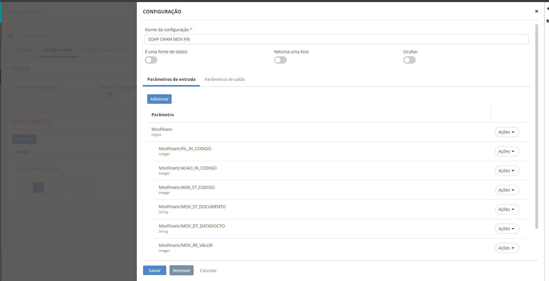 Na aba Configurações, você definirá os parâmetros de entrada e saída da requisição. Ao clicar em "Adicionar", iniciará a configuração. Para cada serviço, é necessário informar os parâmetros de entrada conforme a estrutura do XML que será enviado.
