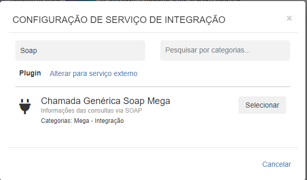 Para configurar o conector, clique na opção Plugin, busque pelo plugin Chamada Genérica SOAP Mega e clique em Detalhes.