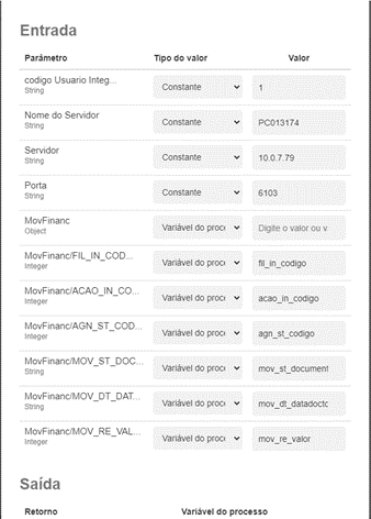 Se os parâmetros forem utilizados de forma global, o usuário deve preencher os valores de Código do Usuário de Integração, Nome do Servidor, Servidor e Porta nos parâmetros de entrada. Para a configuração individual, esses valores devem ser definidos na chamada da API.