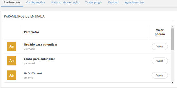 Se os parâmetros de autenticação forem configurados globalmente, o usuário deve preencher os valores de Usuário, Senha e TenantId nos parâmetros de entrada. Se os dados de autenticação não estiverem definidos como globais, eles devem ser especificados na chamada da API configurada. Consulte o Passo 4 para mais detalhes.