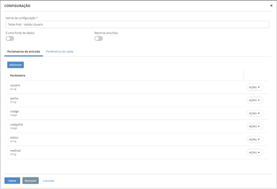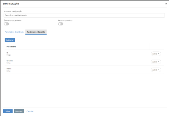 Nos parâmetros de saída, serão informados os campos de retorno das chamadas POST e GET. É importante lembrar que esses retornos serão apenas do objeto principal, não sendo possível definir como parâmetro de saída objetos que estão aninhados dentro de outro objeto.