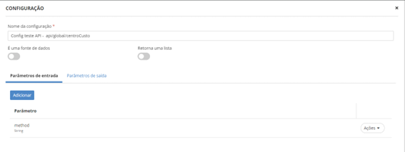 Na aba Configurações, você definirá os parâmetros de entrada e saída da API a ser consumida. Ao clicar em ADICIONAR, você iniciará a configuração. Para APIs que utilizam o método POST, é necessário informar os parâmetros de entrada e incluir um parâmetro chamado method. Este campo deve ser utilizado para especificar o método da chamada.