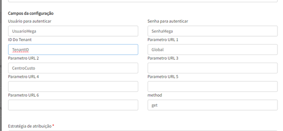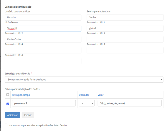 Nos campos de configuração, o usuário deverá informar os dados de autenticação: Usuário, Senha e TenantId. Em seguida, ele deve configurar os parâmetros da URL.