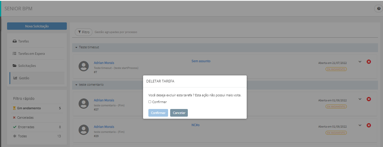 Após clicar no botão, o sistema irá solicitar a confirmação da exclusão antes de efetuar a mesma, contendo uma maior assertividade e segurança ao realizar a exclusão. Lembre-se, caso a tarefa seja excluída, não será mais possível trabalhar com a mesma.