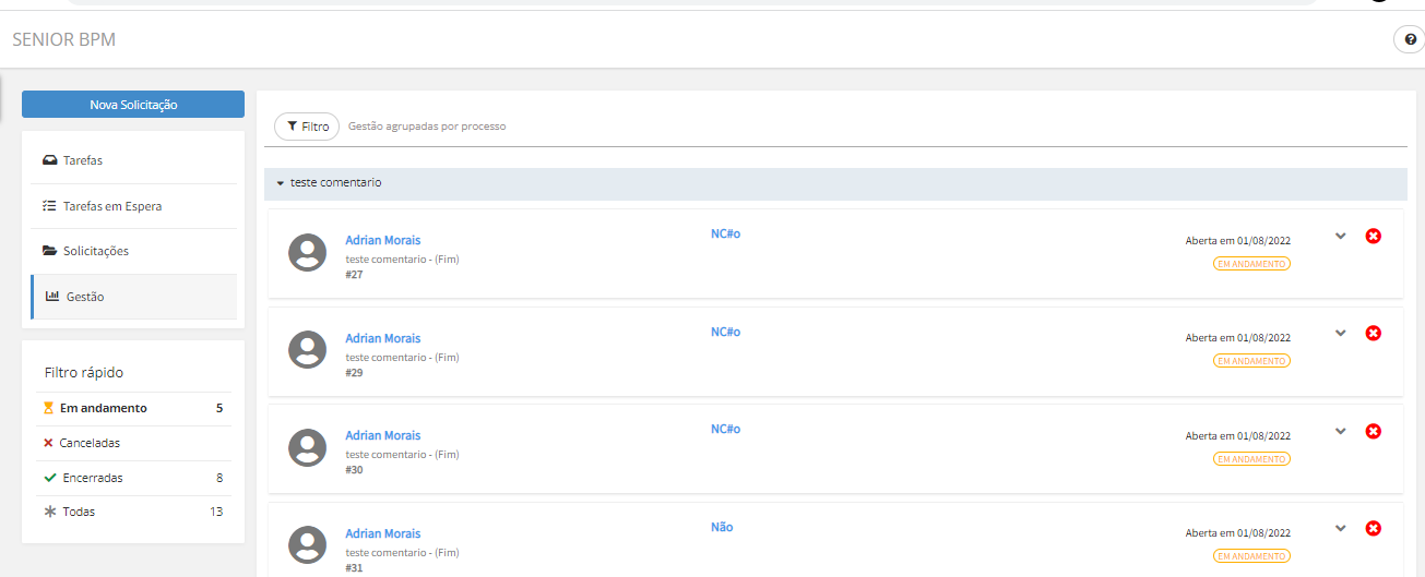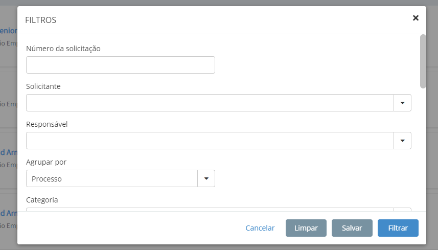 Em todas as guias, seja Tarefas, Tarefas em Espera, Solicitações ou Gestão, possuem filtros que podem ser aplicados para sua tela, as opções de filtro seguem o mesmo padrão em todas as telas, sendo exibidos os campos: