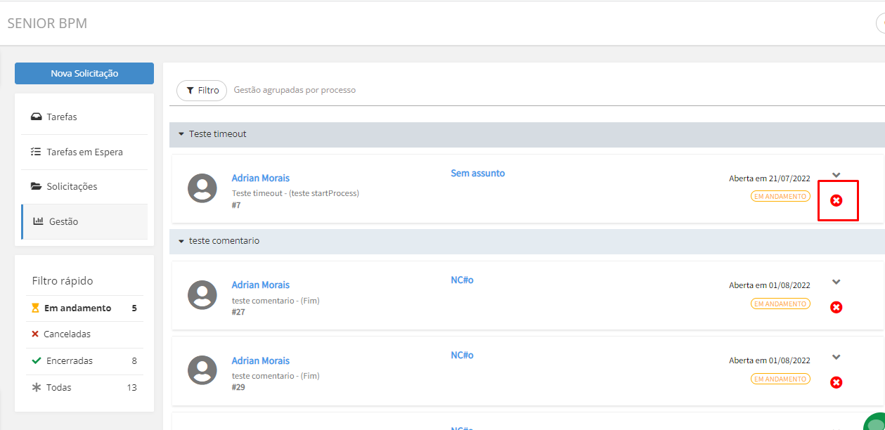 Para visualizar o botão e realizar a exclusão de uma tarefa, o usuário deve possuir as permissões de coordenar e de editar processos. Lembrando que, caso o usuário exclua uma tarefa, não será possível o mesmo voltar a trabalhar nela, porém a mesma permanecerá no banco de dados para consultar ou auditar os processos que já foram realizados ou deletados.