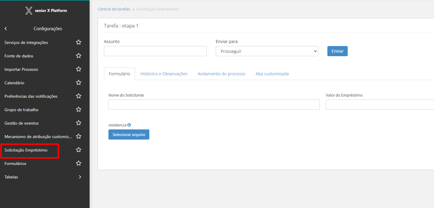 Com isso o processo será exibido no menu Configurações, no exemplo abaixo temos o processo de Solicitação Empréstimo, exibido diretamente no menu.