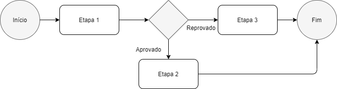 Este fluxo mostra que o processo simplificado permite somente que o processo vá para a frente ou para trás. Já o fluxo abaixo, não pode ser considerado simplificado, pois gera uma variação do caminho a ser seguido no processo. Para saber mais sobre como construir este tipo de processo, consulte a documentação sobre construção de processos BPM.