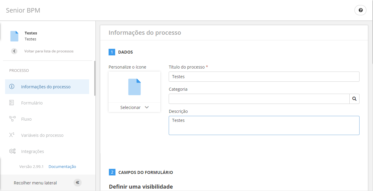 2. Escolha o ícone que vai representar este processo, preencha os campos Nome e Descrição do processo, e clique em Salvar;