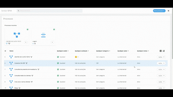 Para visualizar as avaliações, localize o processo desejado na lista acessando Senior Flow> BPM > Processos. Clique em Ações e selecione a opção Avaliações. Será exibida a média e o total de avaliações, além dos comentários, que serão listados em ordem cronológica (do mais recente ao mais antigo).