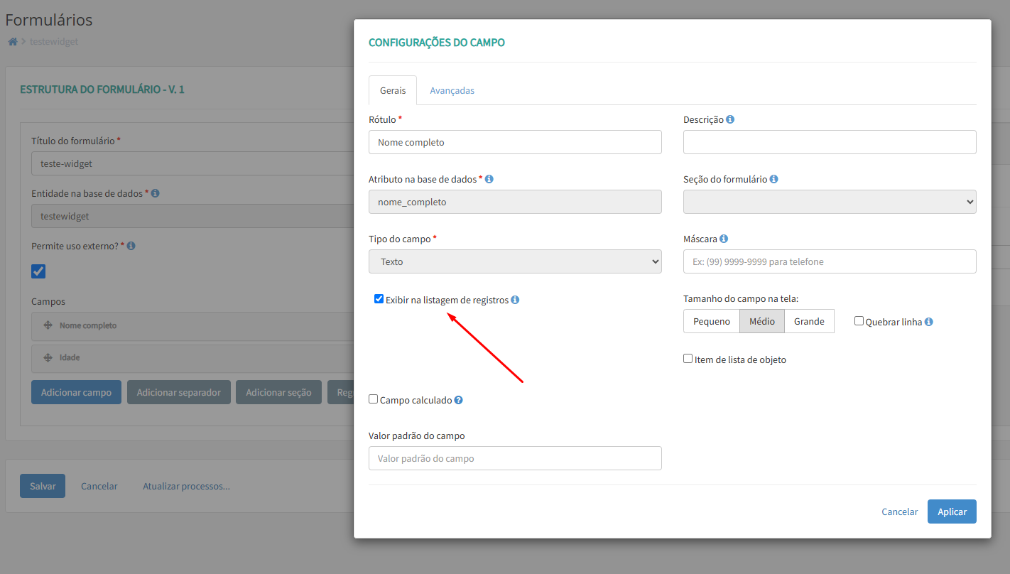 Na opção de configuração do campo do formulário habilite a opção Exibir na Listagem de Registros