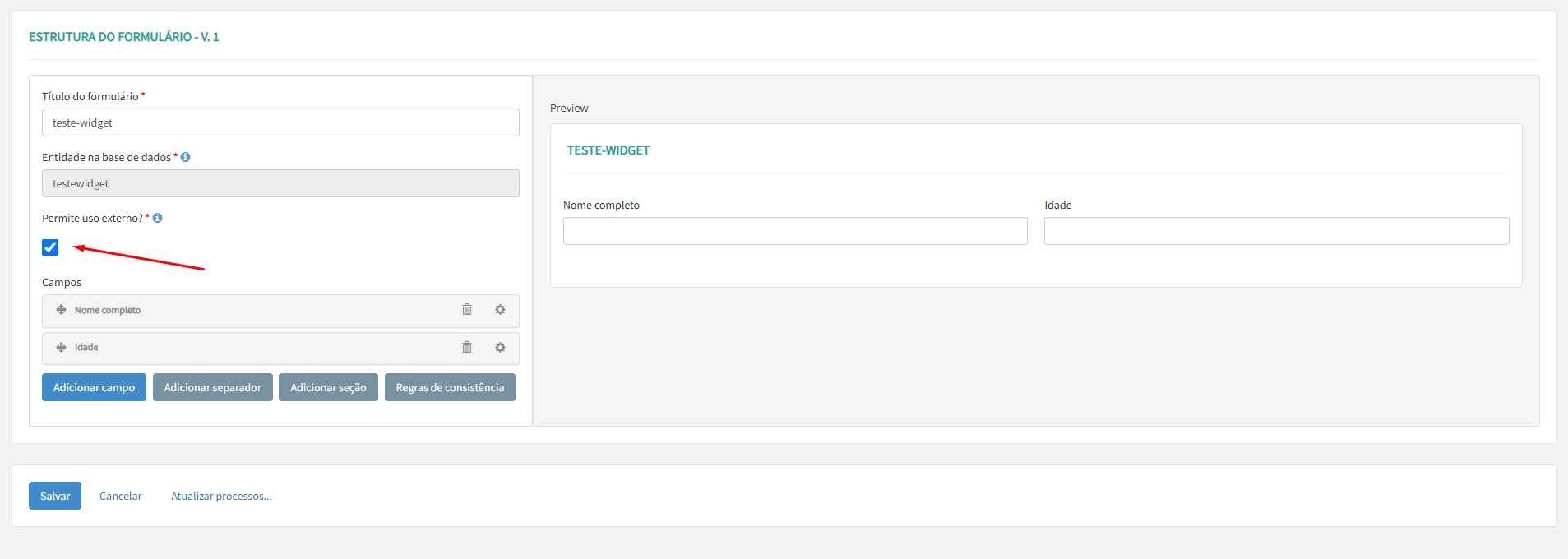 Ao menos um campo do formulário deve ser habilitado para que a configuração possa ser salva.