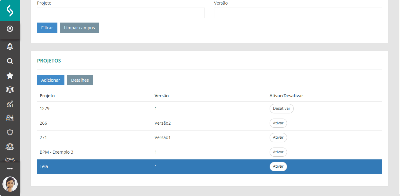 Depois que o novo projeto de menu for criado, o mesmo irá aparecer na listagem de Projetos da tela de Gestão de Menus e Telas. Selecione o projeto criado e clique em Detalhes para configuração do link de acesso. Na tela do projeto, na sessão Telas, clique em Adicionar para iniciar a configuração desta tela.