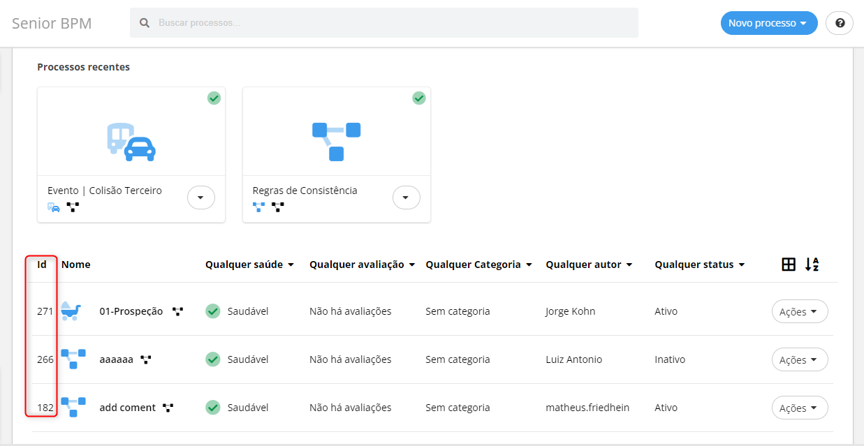 Antes da criação do menu propriamente dito, é necessário verificar de qual processo será criado o link. Para isso, acesse Senior Flow > BPM > Processos, e verifique na lista de processos qual o processo que deseja criar o menu customizado. Copie o ID do Processo e guarde esta informação para ser utilizada na configuração da URL.