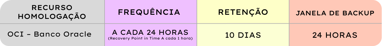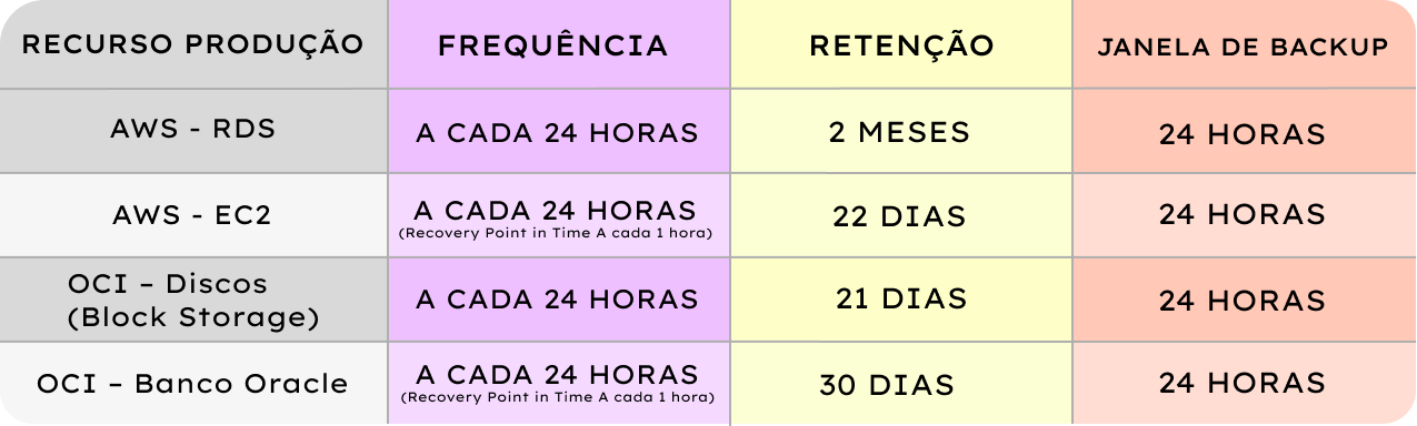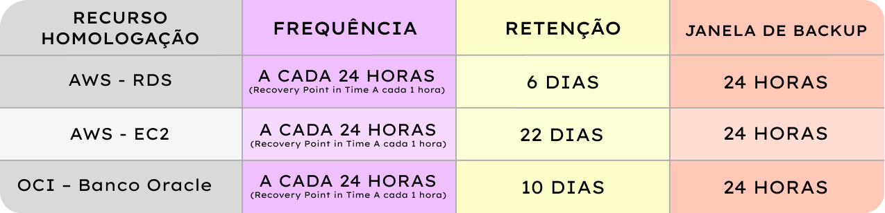 - Frequência: A cada 1 hora (Recovery point in time) e Diária (Produção e Homologação);