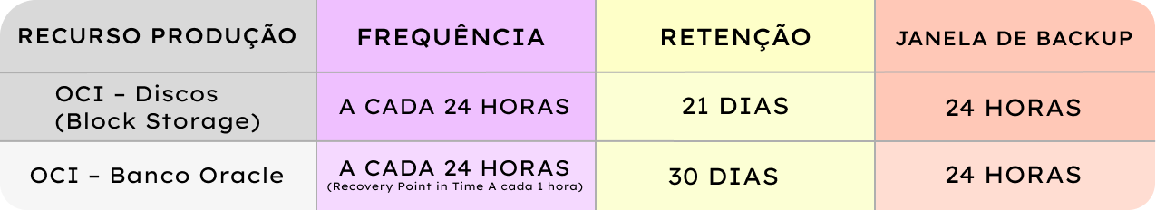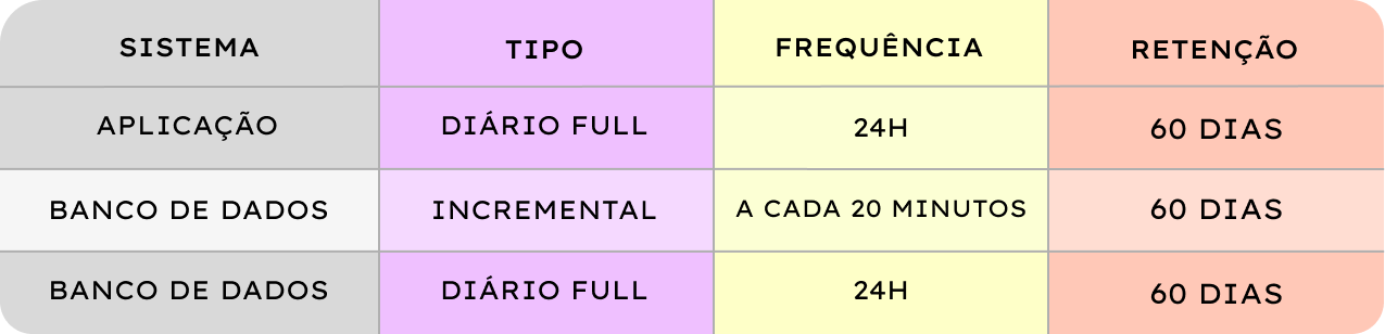 - Backup diário (a cada 24 horas), com retenção de 2 meses.