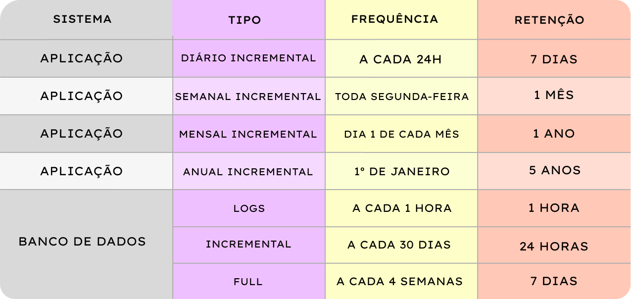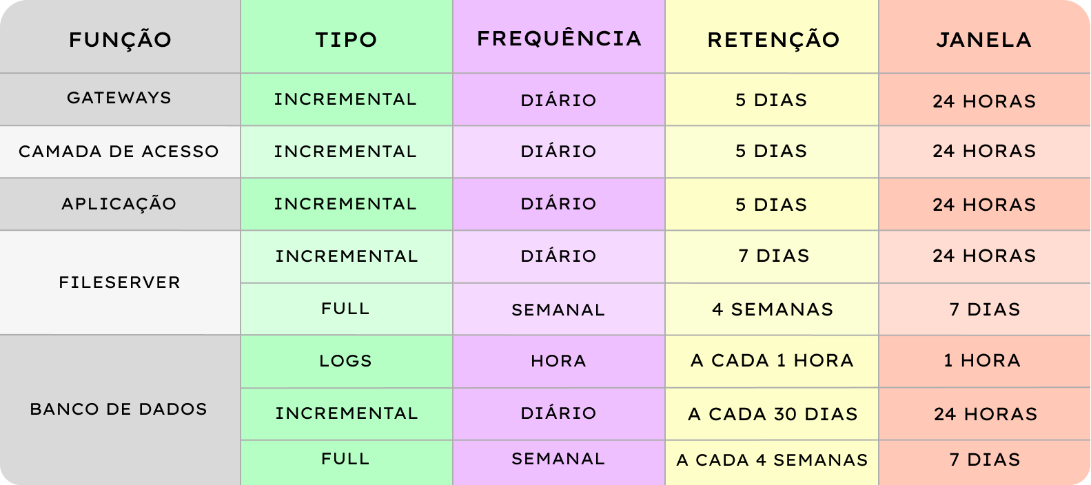 - Retenção: 7 dias para backups Diários, 7 dias para backups Semanais e 6 meses para backups Mensais.