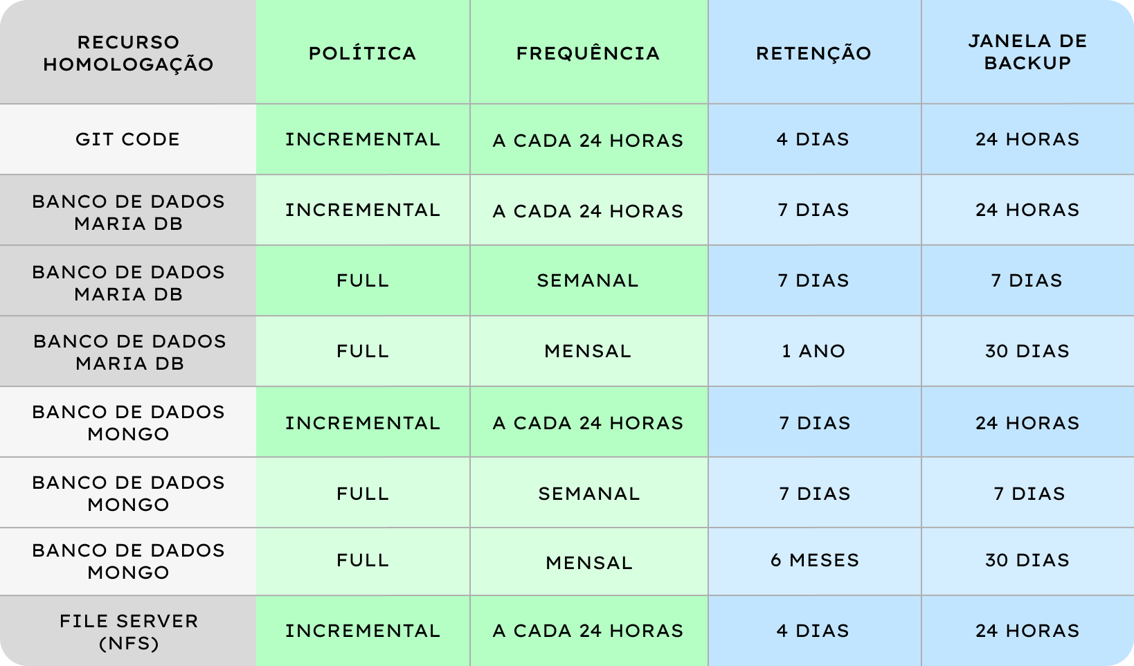 Em geral, a principal diferença entre a política de backup de produção e a de homologação reside nas frequências e retenções, que são menores na homologação devido à sua menor prioridade. No entanto, para atender às necessidades do ambiente, foram definidas politicas iguais para o ambiente Mizar.