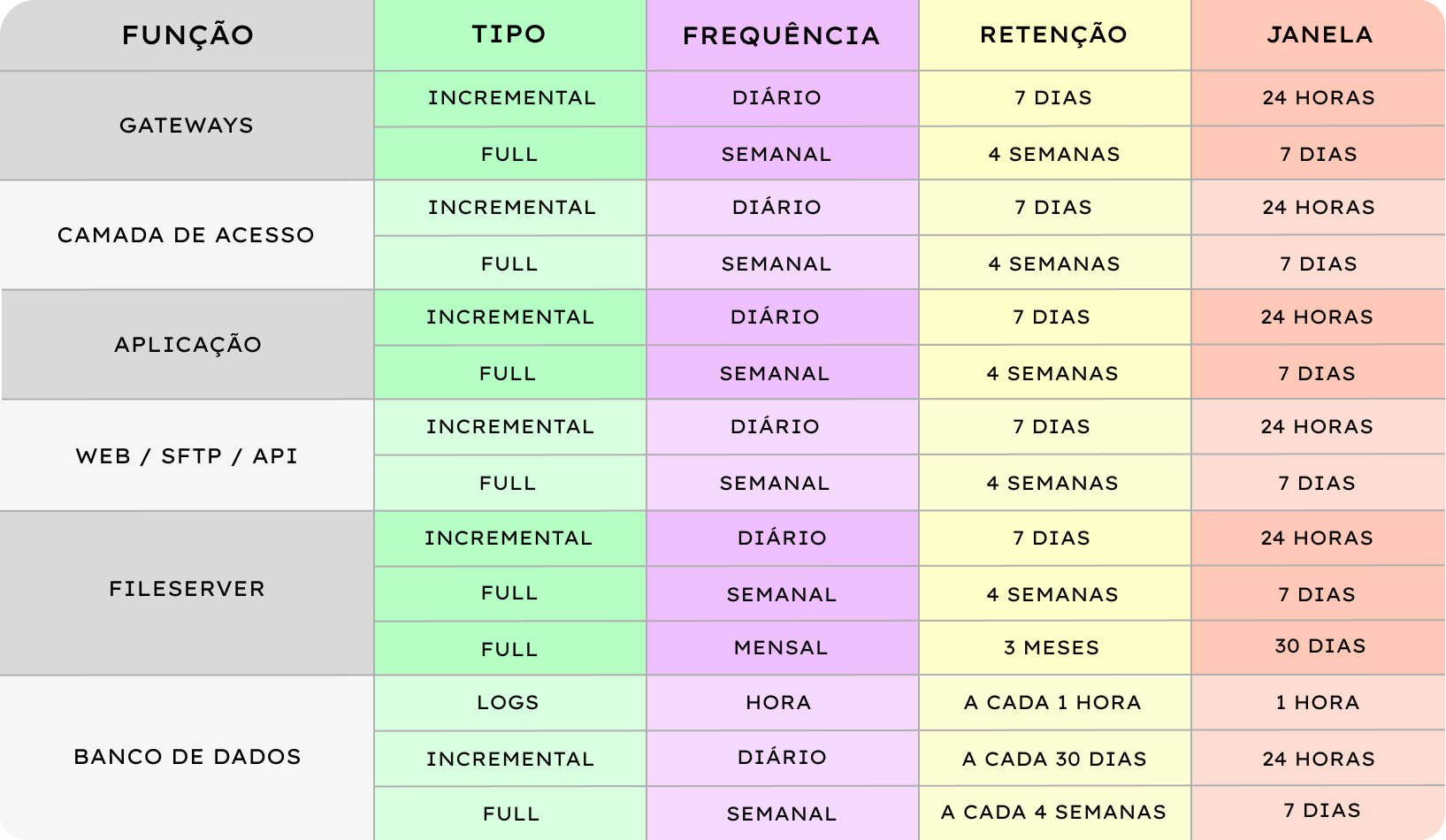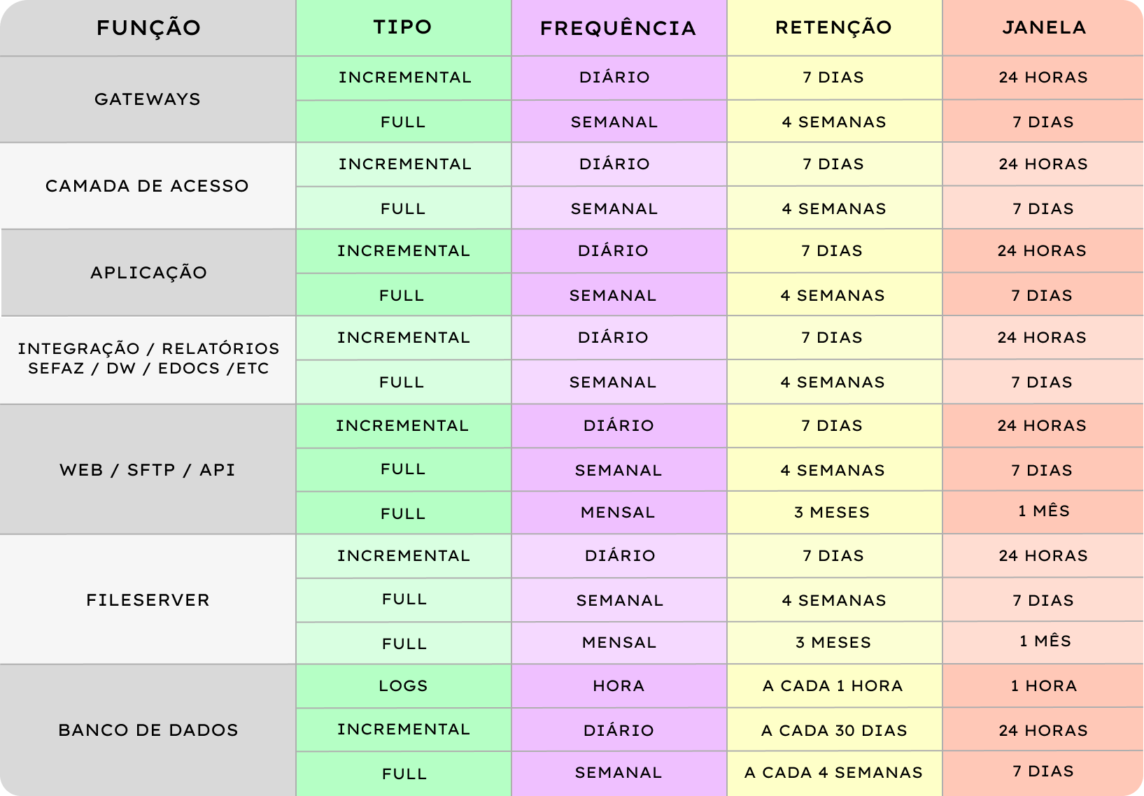 - Frequência: Diária Incremental, Semanal Full e Mensal Full;