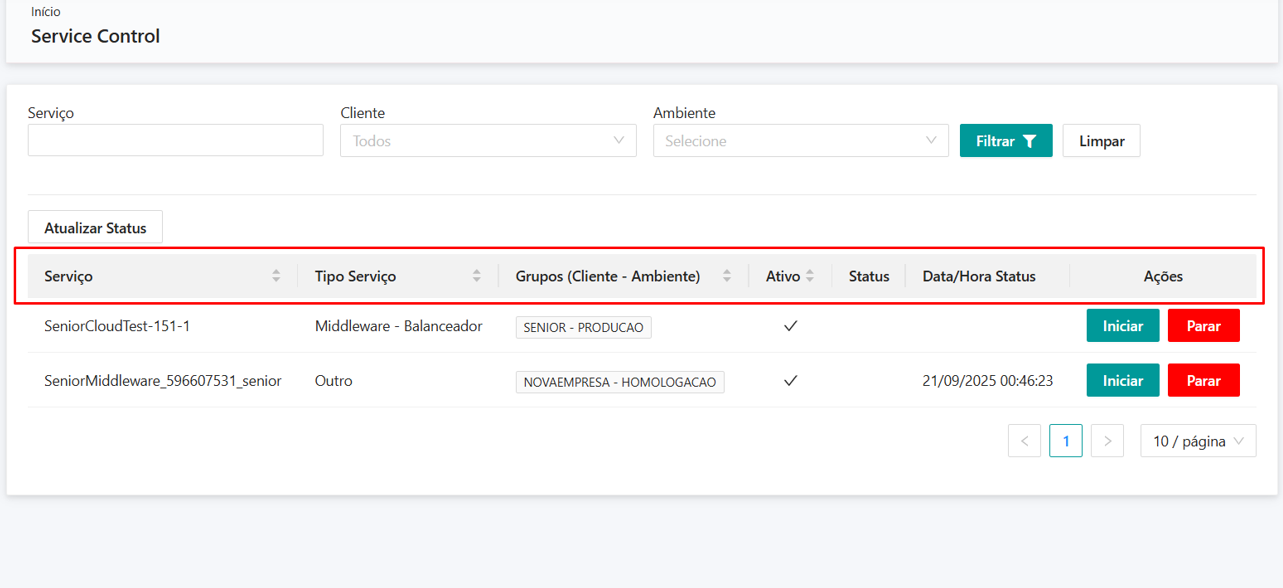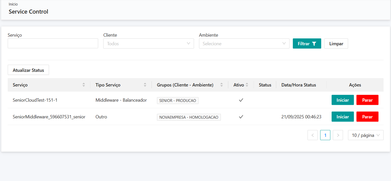 Na barra superior, é possível filtrar os serviços por nome, cliente ou ambiente que deseja visualizar: