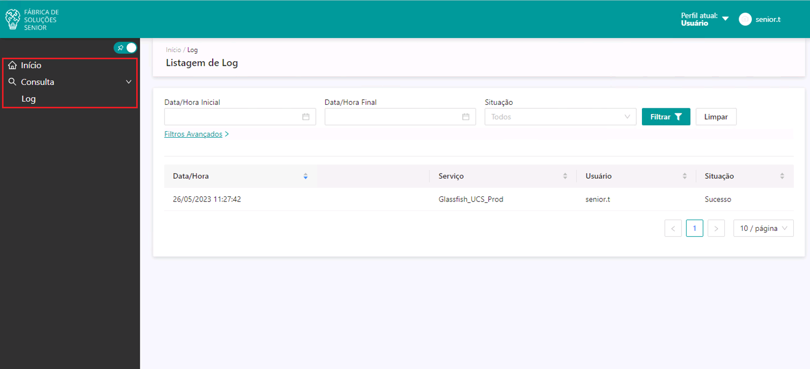 Para ter controle de todas as ações, a ferramenta disponibiliza uma lista de Logs referentes aos serviços que sofreram alguma alteração. A tela de Logs pode ser acessada através do menu lateral na opção Consulta e Log: