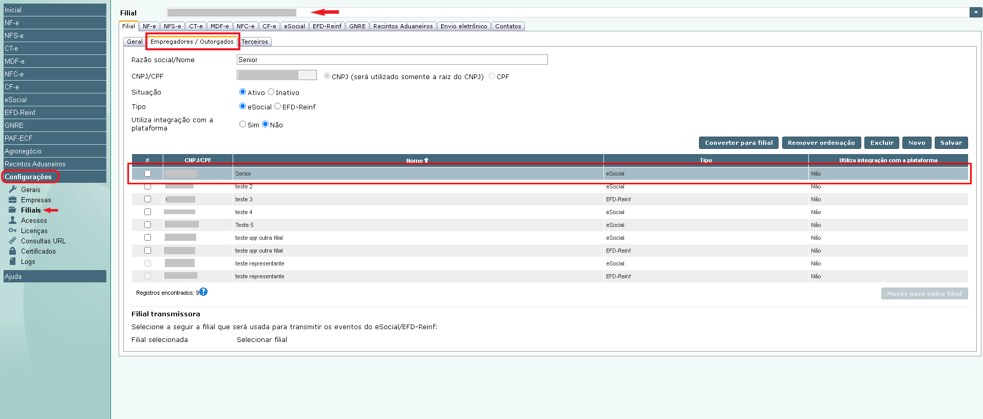 3. Após isso, acesse a aba Empregadores / Outorgados e selecione o emissor para o qual deseja ativar a integração de SST com a plataforma, conforme exemplos abaixo: