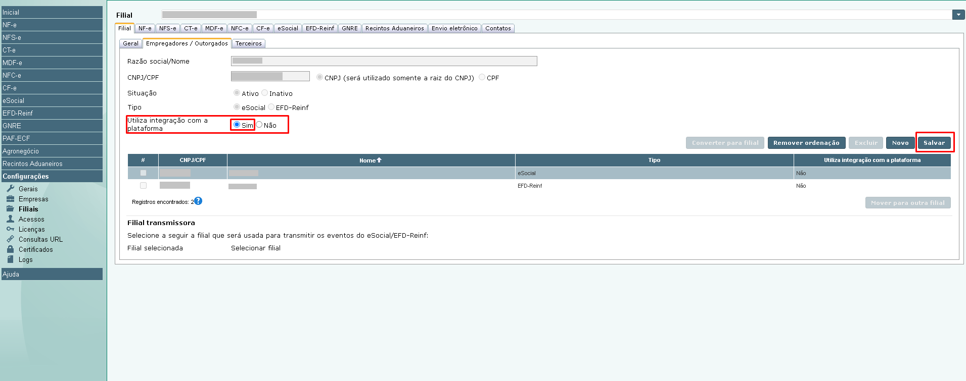 4. Após selecionar o Empregador / Outorgado, altere para a opção Sim o campo Utiliza integração com a plataforma e clique em Salvar.