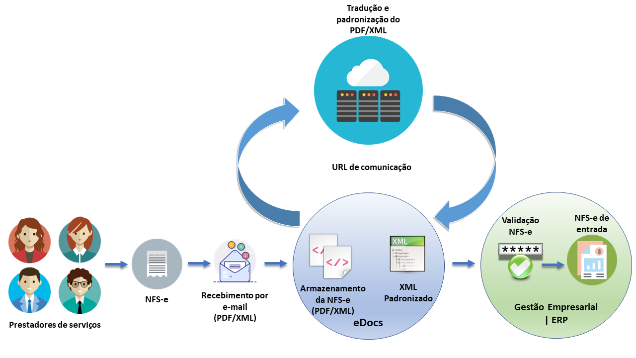 As NFS-es emitidas pelo prestador de serviço contra o CPF/CNPJ do usuário do eDocs devem estar no formato PDF ou XML, sendo compactado ou não. Estes arquivos recebidos por e-mail serão interpretados pelo sistema e enviados para o serviço de processamento do Cloud Senior, onde serão convertidos para um formato de PDF/XML padronizado para depois serem enviados para o ERP, onde o usuário poderá realizar a validação e efetivar a entrada do documento fiscal.