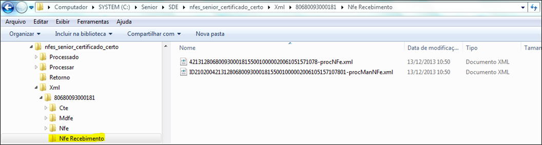 A imagem acima indica a pasta dentro do diretório de integração da filial onde o eDocs armazena os arquivos XML de NFS-e recebidos e autorizados (também válido para NFS-e), quando o parâmetro Armazenar XML processado em disco estiver ativado. Sendo assim, podemos definir que o eDocs armazenará os arquivos XML de recebimento no seguinte caminho: