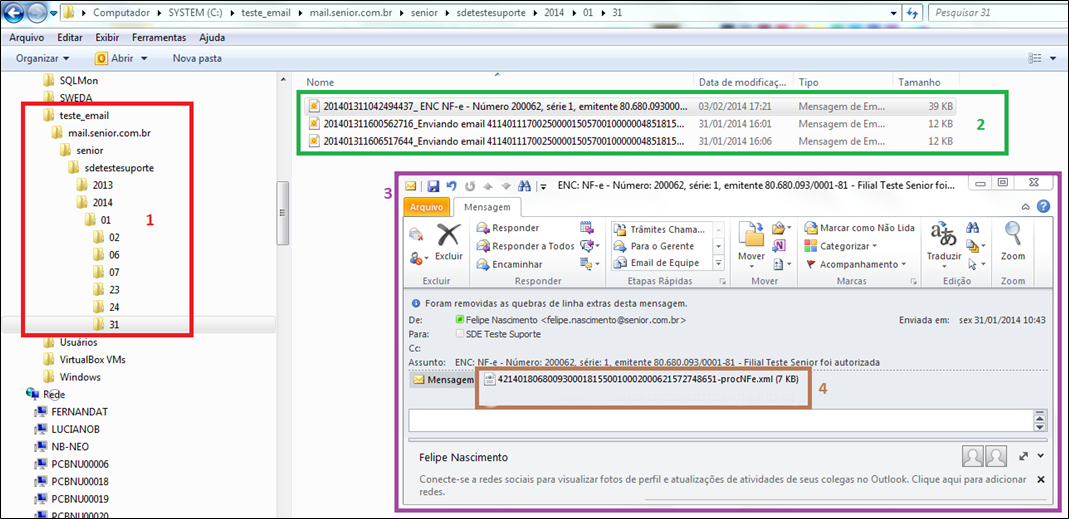 2. Arquivos .EML:acessando a pasta referente ao dia que o arquivo XML foi lido pelo eDocs, é possível acessar todos os arquivos .EML baixados da caixa de entrada do endereço de e-mail em questão. O arquivo .EML é salvo com nome indicando “Ano/Mês/Dia/Hora” da leitura do e-mail pelo eDocs, concatenado com um número inteiro equivalente aos segundos/milissegundos, concatenado com o título do e-mail. Desta forma, é fácil encontrar o arquivo .EML de um e-mail, quando há necessidade de efetuar a procura pelo mesmo