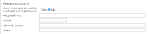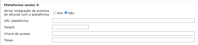 - Acesse o menu de Configurações por empresa, guia Integração e preencha as informações no grupo Plataforma senior X com a URL base da Plataforma, o nome do tenant e as chaves geradas pelo Gerenciamento de aplicações