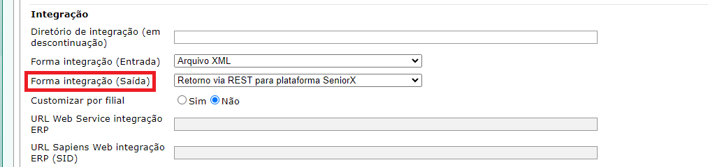 - Após isso, acesso o menu de Configurações por filial, guia Filial > Geral e, no grupo Integração, altere a opção Forma de integração (Saída) para "Retorno via REST para plataforma SeniorX"