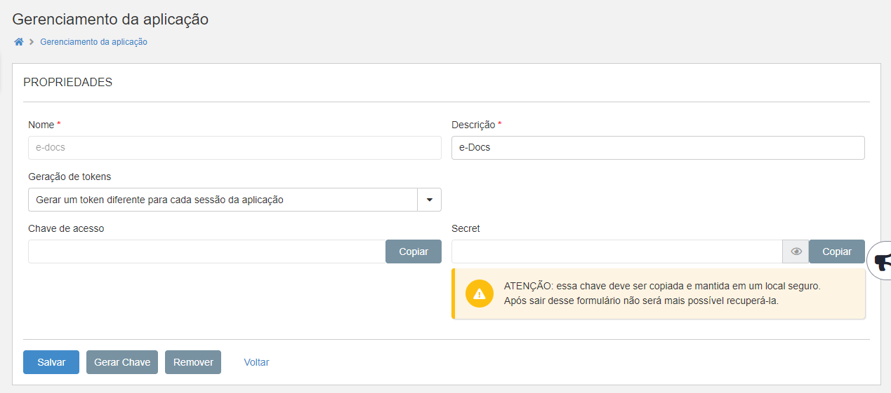 O cadastro é feito via menu Tecnologia > Administração > Gerenciamento de aplicações, na Plataforma. Este método é utilizado por todos os sistemas terceiros que precisam de autenticação para fazer integrações. Na tela de Gerenciamento, adicione um novo registro e preencha os dados obrigatórios. Ao salvar, o access_key e a secret_key serão gerados.