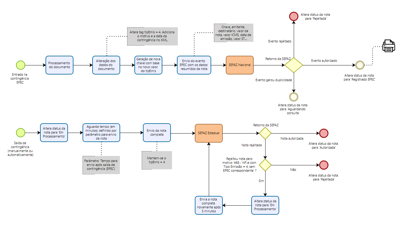 Na saída da contingência, as notas com status "Registrado EPEC" serão enviadas para a SEFAZ estadual para que ocorra a “conciliação” da NF-e com o EPEC registrado anteriormente.