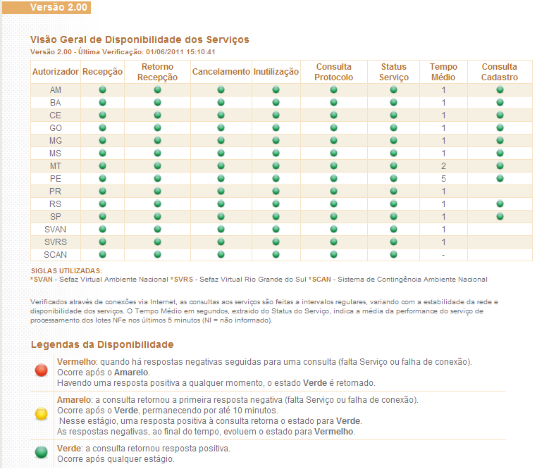 A Secretaria da Fazenda Estadual (SEFAZ) disponibiliza na internet uma página de consulta da disponibilidade dos serviços de processamento do CT-e.